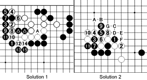 Solution 1: We asked how White could save his stones after black 1. The tsuke-koshi at 2 is White's best move. Black 3 is a good answer, but White forces the issue with 4 and 6 before engulfing Black's marked stones and making an eye in sente with 8 through 14. White's other eye is at A so he is alive.