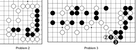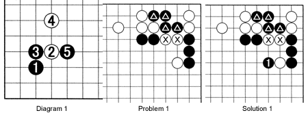 Problem 1: In this situation, Black's marked stones seem to be in a lot of trouble. However, if he somehow captures White's marked stones he is in the clear. Where should Black play?