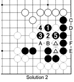 Solution 2: In combination with 3, the hasami-tsuke at 1 is tesuji (locally clever move). After 4, Black cuts with 5 to snap up White's marked stones. If White plays at A instead of 4, black B does the trick. White can't save his marked stones. In combination with a guaranteed eye on the right side through the sequence white C, black D, white E and black F, Black's capture of the two marked stones ensures life.