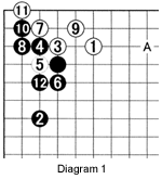 Diagram 3: If a black stone is present at around A, White might want to help his stone at 1 by using the crosscut combination of 3 and 5. Black 6 is a standard response, although this allows White to make a good shape with 7 through 11 in sente.
