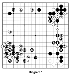 Diagram 1: The problem was how should White respond after Black crosscuts with 1. White has to be careful, as the stones marked with X's are not fully alive yet. He, therefore, chooses the combination 2-4--prompting Black to answer with 3 and 5 to bottle up the stone marked with a triangle--before switching to the top with 6. Since Black cannot invade on the right side, he strengthens his own stones with 7 through 11 and without worrying about White strengthening his position in this area, too. Black then plays 13, forcing White to extend to 14, which has no impact on Black's already strong stones. This way, Black can develop the lower side with 15 through 31. White makes a halfhearted invasion with 34 and 36, but black 41 threatens to connect with A or cut with B. White's stones 34-38 may come under attack later, too. Black is leading and in the end won the game by 4! points. In successfully defending the Kisei title, Hane took home \42 million in prize money.