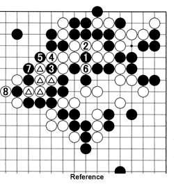 Reference: (black 9 captures 6 at 1) After black 1 (17 in Diagram 2), if White connects at 2, this would be followed by black 3, white 4, black 5, white 6 (which would capture the ko), black 7, white 8 and black 9, which would recapture the ko. White could not win the ko and would, therefore, lose the game. Note that after Black plays at 3, White's marked stones are in danger too.