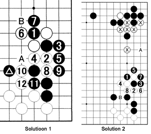 Solution 1: When Black crosscuts with 1 (as in Diagram 1), White can resist with 2 through 8. However, after black 9, White's best option is cutting off the marked black stone, but this would not amount to much. After 12, Black has good moves at A and B, and even if he plays elsewhere, White will be handicapped with the cutting point at A. White's position is not good at all.