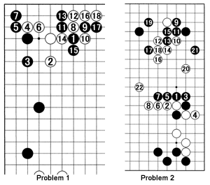 Problem 2: This is from a fast game between top pros. Note the top right is completely different from the game in Diagram 1. With 1 through 7, Black builds thickness to attack in the top right. Where should Black play after white 22?