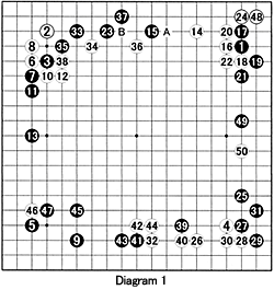 Diagram 1: The moves through 14 are normal, but 15 is a little off as it is usually played at A or at 20. For White to build up influence in the game, it is very important for him to get in a move at B. However, the timing to do this is difficult. Black makes a light shape with 17, 19 and 21, in order to extend to 23. As he fails to use the thickness in both the top left and the top right, this is unsatisfactory for White. On top of that, White has no answer to black 33 and 35. Having to defend with 38 is painful. What White gains in the top right does not compensate for his loss at the top. White is falling behind in territory and has no choice but to invade at 50. Instead of playing aggressively at 18, where should White have played?