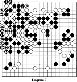 Diagram 2: (1-24 represent moves 133-156; 9 is played where the marked stone was captured): White plays a tricky combination of 10 and 12. Cho should have played at 23 to force 18 at this point, but he fell for the trick and answered at 13. This led to the sequence through 24, and finally to a disadvantageous ko for Black. Cho was frustrated with this result but he refused to resign and eventually lost by 19! points.