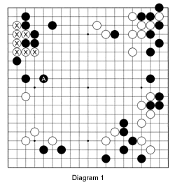 Diagram 1: Last week, we started the fourth and final game between Cho U (black) and Yu Bin for the LG cup. This is the position we ended up with, with Black's last move at A. White should ignore this move for now and consider moves that are more urgent. Where should he play? My question is, should White do something to help the marked stones or is there a more urgent move?