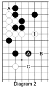 Diagram 2: Those inclined to panic might play at 1 as they perceive the marked stone as a threat to their group in the upper left. Some might challenge A so as to enlarge their eye space (see Reference 1). Because the black marked stone is an attempt to push out into the center, aggressive players see the black group as weak and smell blood. These players will want to cap at B. Others, perhaps licking their wounds from previous failed attacks, might play at C in a simultaneous effort to build territory while launching an attack.