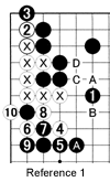 Reference 2: After white 1, Black might play at 2, which could trigger the sequence through 9. Black 10 and 12 defend against the cut at A--White's cutting stones will die if followed by the sequence black B, white C and black D. As you can see, White's marked stones are also up against the wall, literally. Also, White's territory on the left is no match for Black's center influence.