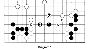 These are the last three moves we looked at last week. Black 1 is aiming at moves like A and B, while 3 threatens to cut at C. In analyzing the game, the pros concluded that Black's chances of prevailing were 50 percent. Usually, most pros will agree on some "best" strategy or move. However, without this consensus, they felt White had two alternatives.