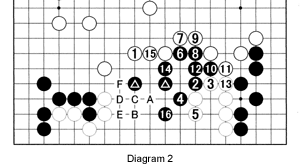Diagram 2: It is realistic to assume White's chances of killing Black's marked stones are only 50 percent. If White safely responds to each of Black's threats 2 through 16, Black will easily make life with his last move. The sequence white A, black B, white C, black D, white E and black F puts White on the spot. However, White probably would offer more resistance earlier in the sequence from 3 through 16. The problem is when and how. Pros don't like to kill stones because this generally provokes maximum resistance from an opponent. However, if you are having a poor game, going for the kill is not a bad idea.