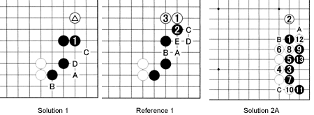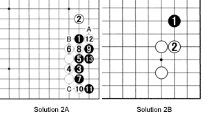 Solution 2A: Black 1 is a common way to attack White's corner formation. Usually, pincering with 2 is best. Black will invade the corner with 3 and the moves through 13 are a possibility. After this move, White can play A, B or C depending on the situation.