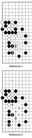 Reference 1: Instead of 1 in the game, where should Black have played? According to Masaki Takemiya, a veteran 9-dan and former Honinbo titleholder, Black should have played at 1 (white 10 in Diagram 1), then at 3. This would have prevented White from playing sente moves (moves that have to be answered) at 8 and 10 in the actual game.