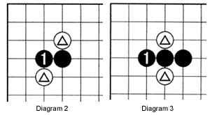 Diagram 3: In this case, Black can wreck White's position by cutting through with 1. Again, because White's marked stones are so close together, this makes the cut all the more serious--hence the tighter the cut, the more effective it is.