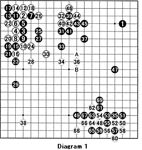 Diagram 1: Apart from moves at 1 and 38, this diagram is basically made up of two giant joseki, the nadare in the upper left and the one in the lower right. The nadare, or avalanche joseki, is a large-scale joseki full of possible deviations. For example, black 23 could have been played at 26 to give it a more contemporary look. However, Black chose the traditional continuation to 33, then switches to 35 to take sente (initiative). Instead, he could have kept up the pressure in the center by playing at A. If White plans to occupy the lower right, a white move at B is good. When Black plays the last move in the joseki at lower right--move 69--he has built a splendid moyo (sphere of influence) on the right. White must now try to contain Black's moyo. Note that he has a potentially weak group in the center. We will continue this game next week.