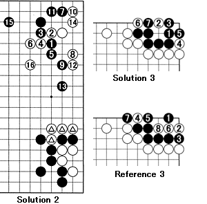Solution 3: Black 1 is correct. Even if White plays at 2, 4 and 6, Black can make two eyes with 3, 5 and 7.