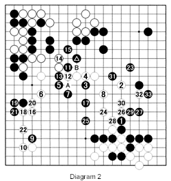 Diagram 2 (1-32 represent moves 69-100): After white 2, Black has to attack. He does this with 3 and 5. White must not play at 13, because the sequence black A, white B and black 6 would be terrible for White. It is important to resist with 6 and 8 even if this allows Black to cut with 11 and 13. A battle now erupts centering on White's group that is cut off on the right. The problem for White is to stay alive while not giving Black too much territory on the right. To that end, how should White proceed after 33? We will continue this game and find out the answer next week.