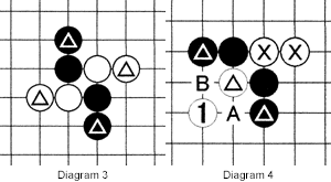 Diagram 3: This formation appeared last week. Even without the marked stones, both Black and White cut and are cut at the same time. The marked stones emphasize the cut and strengthen the cutting stone in the most efficient way.