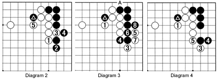 Diagram 4 (black 2 is played elsewhere): After white 3, B1ack may choose to defend with 4, allowing White to seal off the center with 5. This is clearly superior to Diagram 2 for White.
