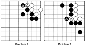 Problem 2: How can Black attack White's corner? Supposing the exchange of the marked stones is not made, how can White fight off this attack?