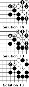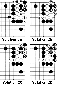 Solution 2A: This is a complicated problem. Because of the exchange of the marked stones, Black can invade with 1, leading to the sequence through 8. He now has three options. First, he can play at 4, making seki. Second, he can play at A and later at B and C to start a ko, if he has many ko threats. Third, he can wait for White to initiate a solution. However, White cannot really do anything except hope Black does not have many ko threats.
