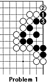 Problem 2: This is from a famous game in 1872 in which Shuho Murase (who later became Honinbo) lost a game to Honinbo Shuwa (white) by 3 points due to a blunder involving damezumari. The blunder was the combination 1 and 3, which White took advantage of after black 7. Where did White play?