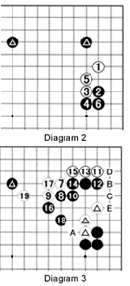 Reference 2: If White plays at 1 immediately, Black will respond with 2. White 3 and 5 are a clever combination, but White is in trouble after 8. White can exchange C or D for A, but Black has the initiative. Note that white A will be answered by black B. In effect, Black has saved one move (at C) in the corner to take the lead in the center.