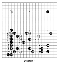 Diagram 1: In the opening, Black sets up a large-scale framework through 13, which was followed by White's invasion at 14. Both sides display a lot of fighting spirit in the sequence through 23. The moves 24 to 32 are more or less forced, but black 33 is a bad move (see Reference 1). This also led to Black's next blunder, move 37. The exchange 37 for 38 does not reinforce Black's position much and it enables White to cap at 40. Black resists with 45, but because she failed to exchange A for B, White hit her hard in this area. We will see how next week.