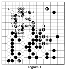 Diagram 1 (1-41, represents moves 71-111): After White cuts at A, Black has the option to play at 7 to threaten White's stones marked B. However, playing here immediately would strengthen White and eliminate other possibilities. The combination 1 through 7 is clever, but White gets a superb center position when she captures two stones with 6 and 8. Black needs to do something to compensate for this, and starts out with 13 and 15. Indeed, White is in trouble after 29 and barely manages to survive up to 40. If Black plays at C, White can cut at D or at E, or play out the sequence white F, black G, white H, black I and white J. This means that if Black plays at K, White must answer at C. There is also aji at L, which Black uses later to destroy White's top left corner. After 41, Black has a good position and goes on to win the game.