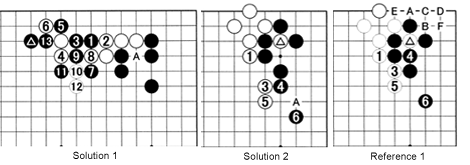 Solution 2 (Black 2 not shown): If Black plays elsewhere after white 1, White's move at 3 is strong. As a White move at A is too much to take, Black must defend with 4 and 6. However, White's influence is overwhelming and his marked stone still has some aji.