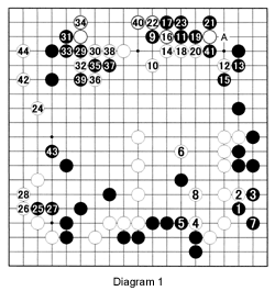 Diagram 1 (1-44 represent moves 41-84): Black's strategy is to keep White on his toes and never stop fighting. First, he invades White's corner in the lower right in sente before invading at 9. This is important because it is White's largest sphere of influence. See Reference 1 for alternative moves White can make. After 23, Black has more territory. However, note that White can play either at 40 or at A depending on the circumstances. But playing either of these moves too early lets Black off the hook. Instead, White attacks with 24. In the sequence up to 44, White is making territory while Black's group is without eyes. What should Black do? We will see next week.