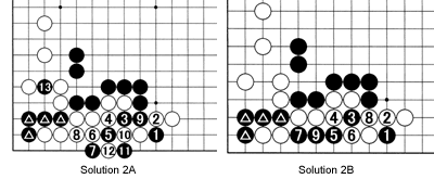 Solution 2B: After 5, White can cut at 6, but black 7 and 9 are a good squeeze. White has to save five stones by connecting at 3.