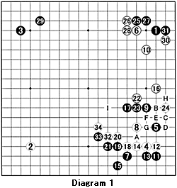 Diagram 1: Cho plays his usual style of capturing territory while Yoda, as expected, intimidates and attacks on a grand scale. White 8 is an interesting move as it makes a better shape than A. White 10 forces Black down and builds influence, preparing the way for a battle in the lower right. The battle starts when Black invades with 13 and White pincers with 16, then builds influence with 18 and 20. White 22 makes Black heavy while 24 attacks the eye-shape. Furthermore, it threatens to connect with E, which would be followed by black F and white D. On the other hand, Black has the opportunity to cut by playing at B, followed by white C, black D. Note White cannot cut with E, as the sequence black F and white G would lead to black H capturing White's cutting stones. Black could have jumped to I next, but Cho instead takes territory with 25, 27 and 29. In a way, he is challenging Yoda to do his worst. However, Yoda does not dabble in petty stuff--he likes to attack on a grand scale. We will see what happens next week.