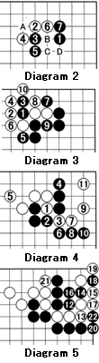 Problem 1: After the joseki in Diagram 2, White needs to reinforce with A or B--these moves seem alike but A poses a big threat. In response, Black will usually defend at C or D. If White plays at A, how should Black respond? And if White extends to B, how should Black respond then? Hint: Look at the cuts at E and F.