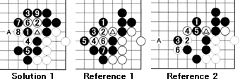 Reference 1: Even when Black plays at 1, he can capture the marked white stone. As you can see, if White tries to escape with 2 and 4, Black bottles him up with 3 through 7. However, black 1 is not the honte move. One reason is that in Solution 1, Black can capture the marked stone outright, which is not true here. Another reason is that White has more efficient forcing moves in the neighborhood.