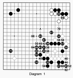 Diagram 1 (35-71): When White plays hane (diagonal connecting stone) with the marked stone, Black abruptly cuts with 35. The moves through 43 follow naturally, but 44 and 46 seem out of place. However, these moves have a deeper meaning (see Reference 1). Instead of these moves, the usual idea would be to connect with 1 in Reference 2. After white 44 and 46, the right side is too large to sacrifice; therefore, Black has no choice but to play outside with 47 and 51. In Reference 2, the meaning of 52 and 53 become clear. White 54 is an exquisite move (see Reference 3). The sequence through 70 is almost forced. Black A would be honte (proper move), but believing he is behind, Black plays at 71. We will continue this game next week.