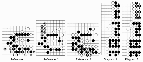 Reference 1 (Black plays 11 at 8): If Black cuts with 1, White would play the combination of 2 and 4. If Black wants to capture these stones he must play at 5, but White has a great combination of 6 through 14. After that, Black could play at A, but White would then connect at B and win the semeai (capturing race). If Black decides to cut at B, this would be followed by white A, black C and white D. White would capture four black stones, which would be a disaster for Black.