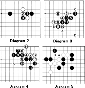 Diagram 2: This is a direct cut in which Black 3 cuts White's position in two.