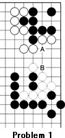 Problem 1: Later in the game shown in Diagram 1, this situation occurred with a cut at A and B. If it is Black's move, how can he make use of these cuts?
