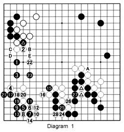 Diagram 1: At this point in the game, there are two important cutting points, at A and at 15. In addition, the black and white marked cutting stones play significant roles. How will the players defend and attack in these areas? First, Black has to reduce the left side, but how? Using his marked stone to move out only splits two fairly strong white groups. In this case, it is better to threaten to pull out this stone. Black 1 is the way to do this. White 2 is a better response than B because it prevents Black from linking up at C. After the exchange 1 for 2 and 3 for 4, Black is not in immediate danger as he has possible moves at D and E. Therefore, he attaches at 5. In the sequence through 21, Black ensures life in the lower left corner while White builds more thickness. Note that Black cuts once with 15. White 22 pushes Black in the direction of White's strength and he strikes with 24 to bottle up four black stones in the sequence up to 28. Note that this also turns the exchange 15 for 16 into a fiasco for Black. In the end, White wins this game by capturing Black's invaders on the left.