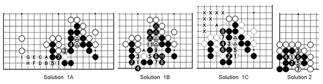 Solution 1A: Since 3 is sente, Black must answer at 4, otherwise White will play at 4 and connect his marked stones. Therefore, if White plays at 1 and Black answers with 2, White exchanges 3 for 4, and then plays at 5. However, at this stage, Black might play at A, followed by white B, black C, white D, etc. to black I. What would happen next is unclear, but when White gets a move around G, as in the game, the combination 1 through 5 works well for White.