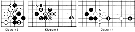 Diagram 2: Before achieving life with 3, Black should first make the kikashi at A. Clearly white B has no other meaning than connecting, but A may have more significance, such as a ladder breaker. At this stage, White must defend with B because then Black has to spend a move at 3. If Black plays at 3 first, White may answer at C after black A.