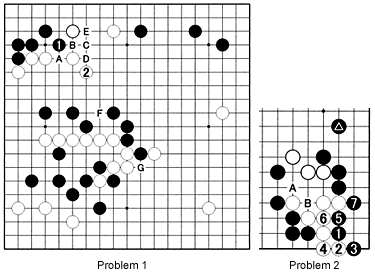 Problem 1: When Black played 1 (13 in Diagram 1), White answered with A, followed by black B, white C, black D and white E. The move at D caused a lot of trouble for White. Wouldn't it be simpler to play at 2 to connect all of his stones? No, as this gives Black many kikashi opportunities to cover his weakness at F. Black can play at G next.