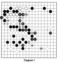 Diagram 1 (1-21 represent moves 55-75): In the previous article, Black played the marked stone, which White bottled up with his marked stone after a few preparatory moves. Is this exchange a kikashi? Before the exchange, Black was unable to cut at 1, but now he grabs his chance. Following the kikashi 2 for 3, White strikes back with 4 and 6. After 9, the question is, can White cut at A?