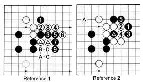 Reference 1: The moves 1 through 9 are a common sequence. Black bottles up the two marked stones but White can still play a kikashi at A, followed by black B, white C and black D. However, Black has no choice but to play 5 through 9, or White captures him in a ladder by playing at 9 himself. Black is clearly worse off in this exchange.
