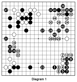 Diagram 1 (1-47 represent moves 35-81): Basically, three exchanges take place in this diagram: at lower right, on the left, and at top right. In the first exchange, Black takes the corner and White grabs the outside. In the sequence on the left, Black profits from his position while allowing White to connect his stones and build thickness. The third exchange at top right is more complicated. When Black invades at 25 a fierce running battle breaks out. Usually tobi, one-point jumps such as 26, 27, 29, 30 and 37, are one way to move out into the center. The object of our study is found in the kikashi exchanges 32-33, 34-35, 38 through 43, and 45-46. We will discuss these moves in Diagrams 2 to 5. In the end, Black switches to 47, a large endgame move, to take the lead in solid territory. How much can White expand in his center? We will continue this game next week.