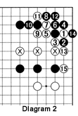 Diagram 2: White's marked stones are fairly weak. White 1 is the first kikashi, which aims at strengthening these stones and attacking Black's. If Black tries to capture this stone with 2, White forces the sequence through 13, and then connects underneath with 15. Now White is strong and Black very weak.