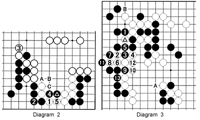 Diagram 3: In response to White's marked stone, Black could cut at 1, but white 2 is a nasty move. If Black wants to keep his center connected he must play at 3. White plays kikashi 4 for 5, and connects with 6. Black struggles to connect with 7 through 13. White can now play at A or B and decide the game by a large margin.