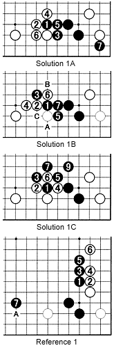 Reference 1: Note the kikashi moves of Solutions 1A, B and C are bad if White has no stone at A. In that case, Black should force the kikashi sequence 1 through 6 and switch to 7 to attack White's isolated stone.