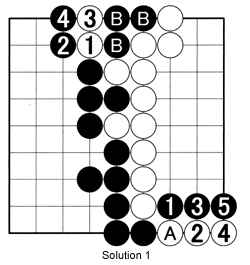 Solution 1: Starting with situation A, black 1 captures one stone. White may try to save this stone with 2, but Black perseveres with 3. After white 4, black 5 is not really necessary, but just for the record--White loses three stones. In situation B, if White cuts at 1, there is nothing Black can do. His best move is playing at 2, making White capture three stones. After 3, Black closes off his territory with 4.